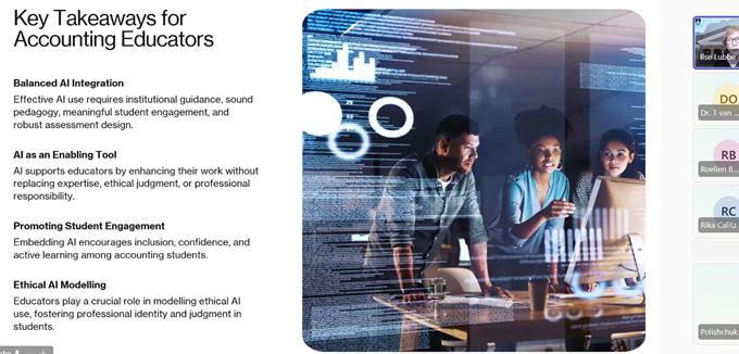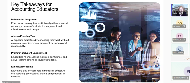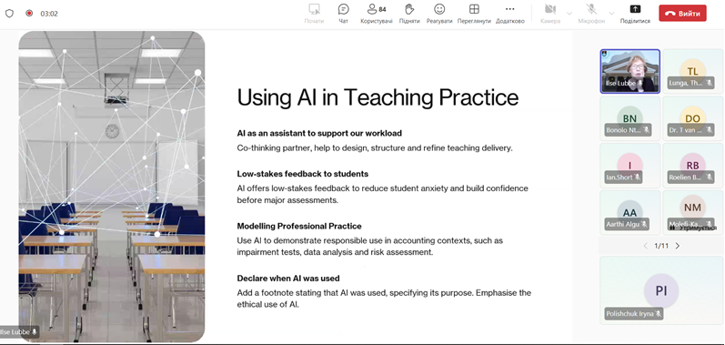 31 березня 2026 року учасники наукового гуртка кафедри інформаційних систем в управлінні та обліку «Соціально відповідальні практики в діяльності українських суб’єктів господарювання» прослухали онлайн-вебінар «ШІ в бухгалтерській освіті» від SAAA (Southern African Accounting Association – Південноафриканська асоціація бухгалтерського обліку).