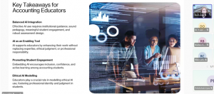 Метою вебінару було обговорення способів, якими викладачі бухгалтерського обліку можуть використовувати ШІ для покращення викладання, оптимізації оцінювання, зменшення адміністративного навантаження, підтримки досліджень, зміцнення рівності та приналежності, а також кращої підготовки студентів до професії, що базується на ШІ.