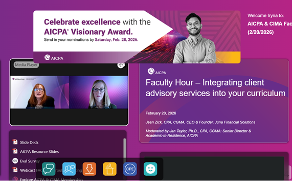 20 лютого 2026 року учасники наукового гуртка кафедри інформаційних систем в управлінні та обліку «Соціально відповідальні практики в діяльності українських суб’єктів господарювання» прослухали онлайн-вебінар «Інтеграція консультаційних послуг для клієнтів у вашу навчальну програму» від AICPA & СІМА (Chartered Institute of Management Accountants – Інститут дипломованих бухгалтерів управлінського обліку).