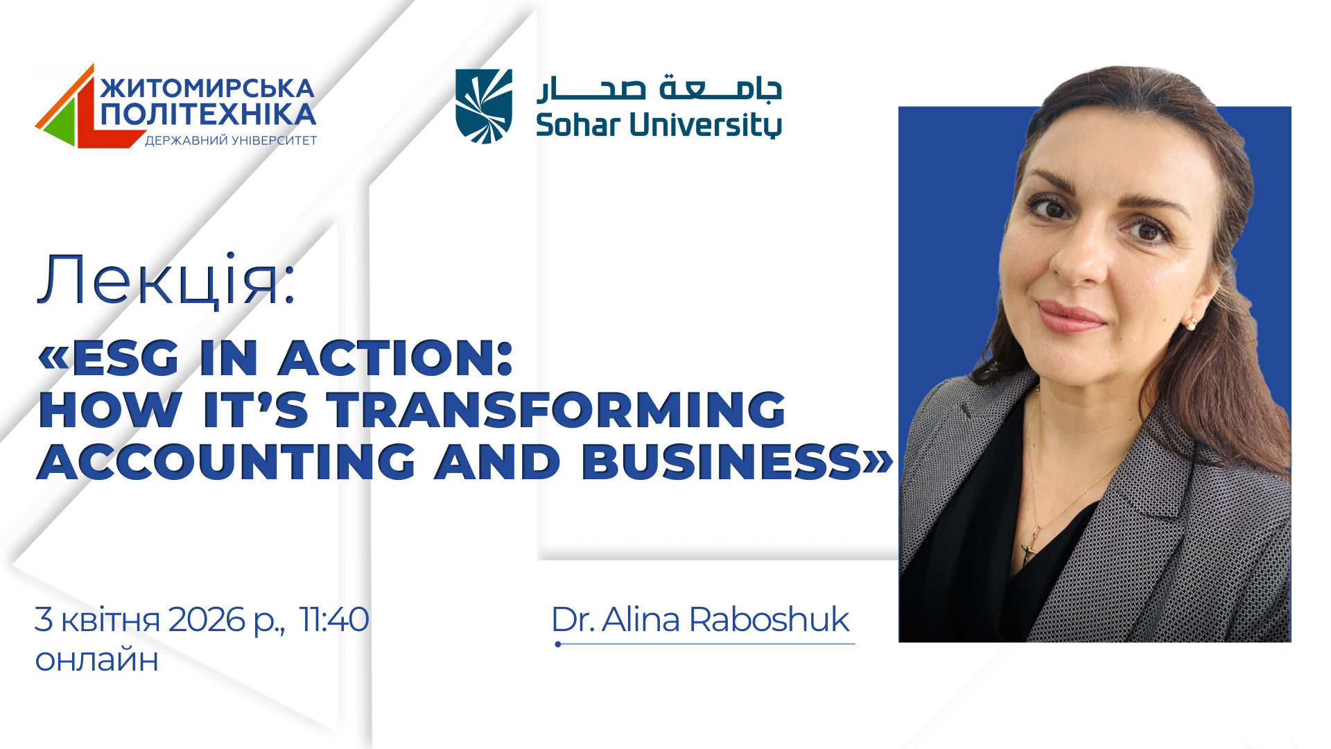 03 квітня 2026 року професорсько-викладацький склад і здобувачі факультету бізнесу та сфери обслуговування та факультету національної безпеки, права та міжнародних відносин прослухали відкриту лекцію доктора Аліни Рабошук (Університет Сохару, Султанат Оман) на тему: «ESG in Action: how It’s Transforming Accounting and Business». Лекція була проведена в межах дисципліни «Стратегічний аналіз», за темою «Особливості стратегічного вимірювання та управління на основі BSC (системи збалансованих показників)».