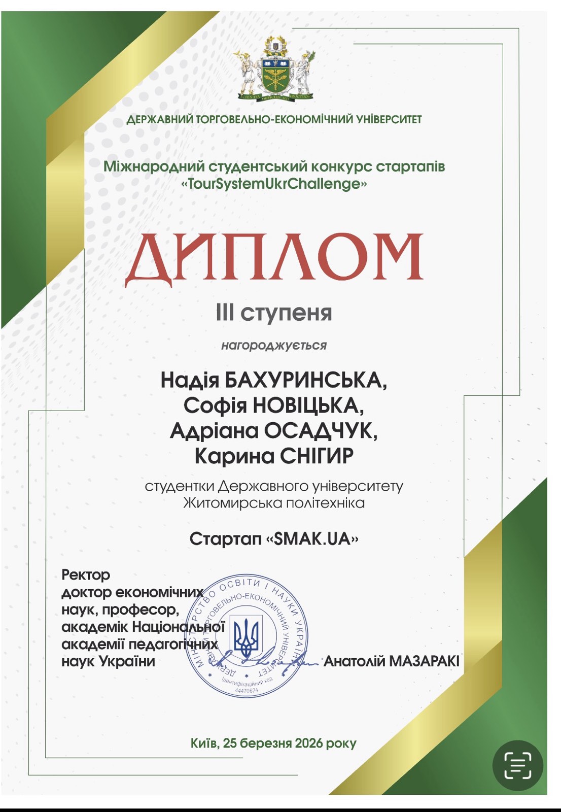 Студентки спеціальності J2 «Готельно-ресторанна справа» Державного університету Житомирська політехніка гідно представили університет на міжнародній науково-практичній арені, здобувши диплом ІІІ ступеня у престижному Міжнародному студентському конкурсі стартапів «TourSystemUkrChallenge», організованому Державним торговельно-економічним університетом. Команда у складі Надії Бахуринської, Софії Новіцької, Адріани Осадчук та Карини Снігір презентували інноваційний стартап «SMAK.UA», який продемонстрував високий рівень наукового опрацювання, прикладну цінність та відповідність сучасним викликам розвитку індустрії гостинності.