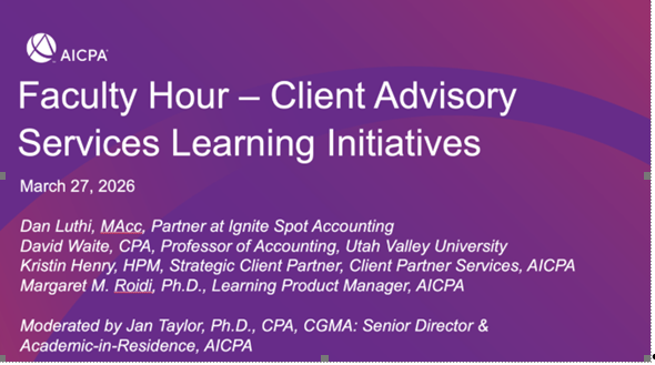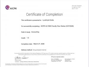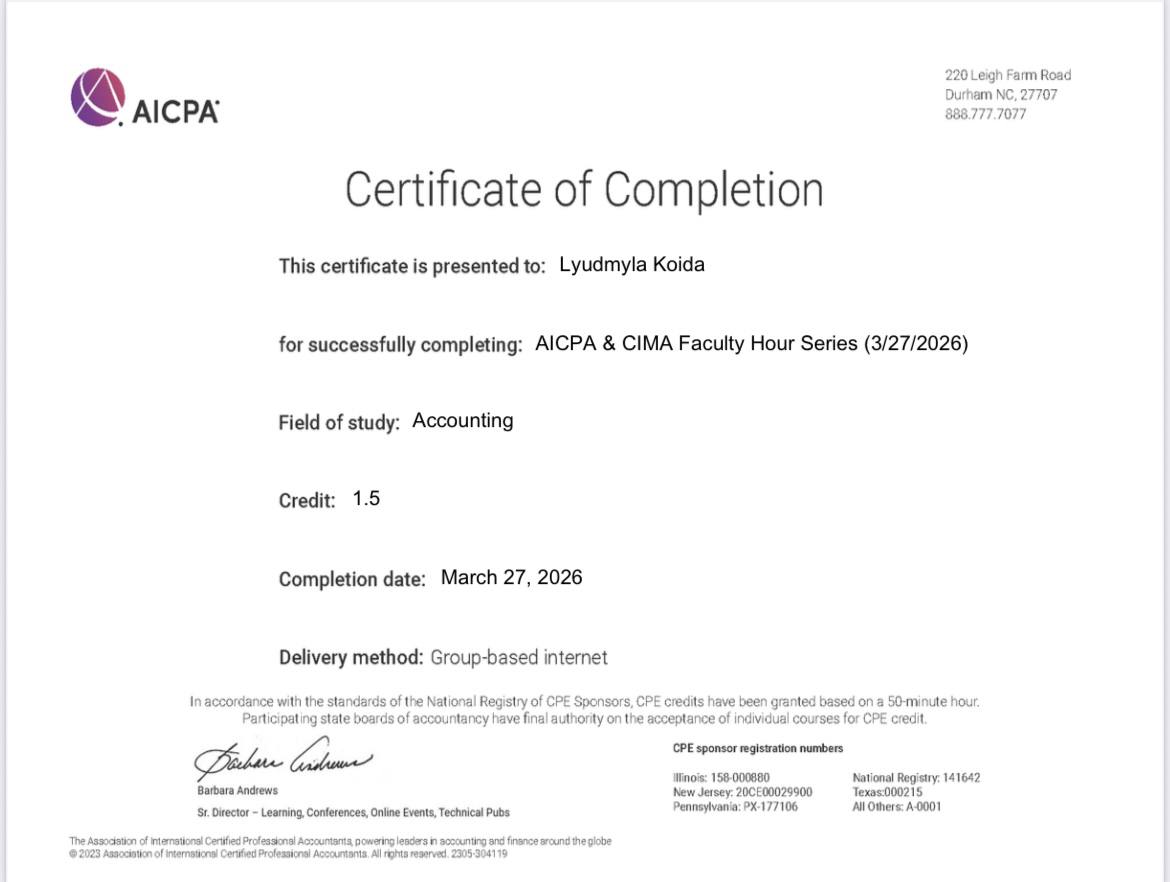 27 березня 2026 року учасники наукового гуртка кафедри інформаційних систем в управлінні та обліку «Соціально відповідальні практики в діяльності українських суб’єктів господарювання» прослухали онлайн-вебінар «Навчальна ініціатива з консультування клієнтів» від AICPA & СІМА (Chartered Institute of Management Accountants – Інститут дипломованих бухгалтерів управлінського обліку).