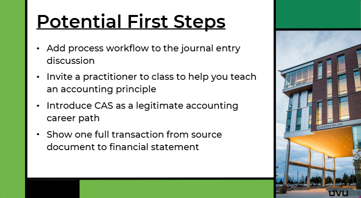 Потенційними першими кроками в реалізації навчальної ініціативи з консультування клієнтів є наступні: додати робочий процес до обговорення записів у журналі; запросити фахівця-практика на заняття, щоб допомогти вам викласти принцип бухгалтерського обліку; представити CAS як легітимний кар’єрний шлях бухгалтера; показати одну повну транзакцію від вихідного документа до фінансової звітності.